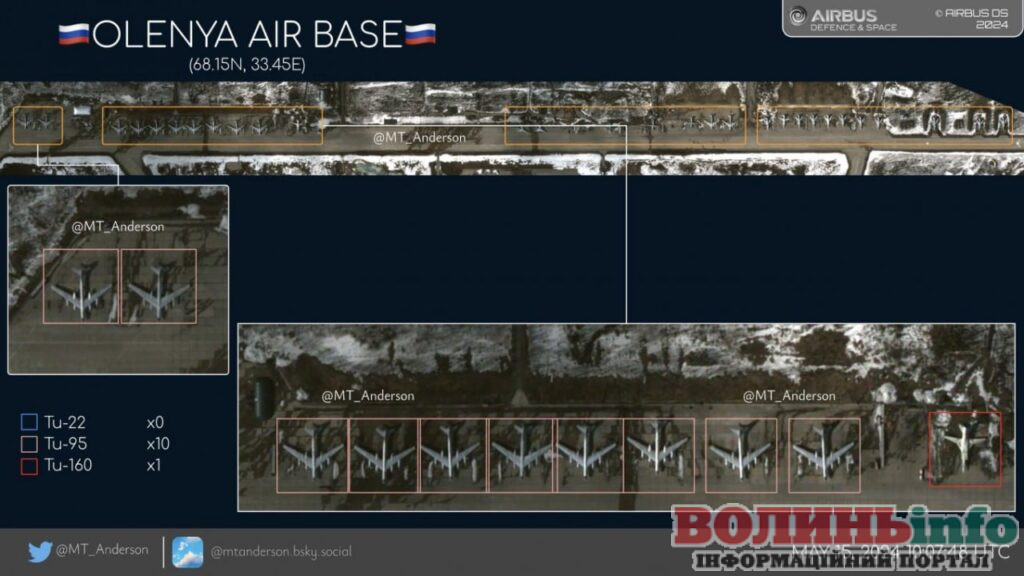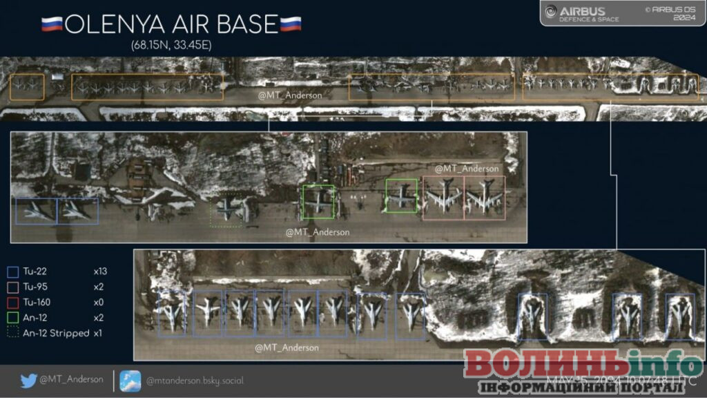 Станом на 15 травня на авіабазі “Оленья” у Мурманській області було зафіксовано значну кількість російських стратегічних бомбардувальників.