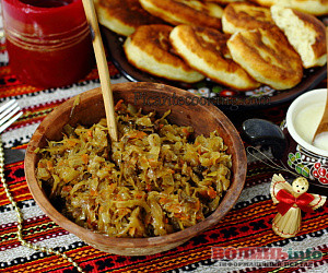 Очищену капусту нашаткувати і покласти в каструлю, додати масло і воду, накрити кришкою і тушкувати 20 хв. Додати цибулю до капусти. Потім покласти в сковороду томатне пюре, оцет, цукор, приправити на смак і продовжувати тушкувати. Коли капуста буде готова (приблизно 30 хвилин), додати обсмажене в маслі борошно, перемішати і прокип’ятити.