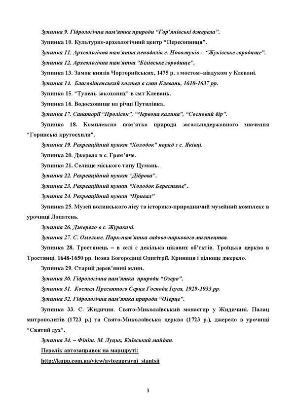Пропонуються пункти зупинки, які туристи можуть обрати на свій вибір. Маршрут пролягає асфальтованими дорогами.