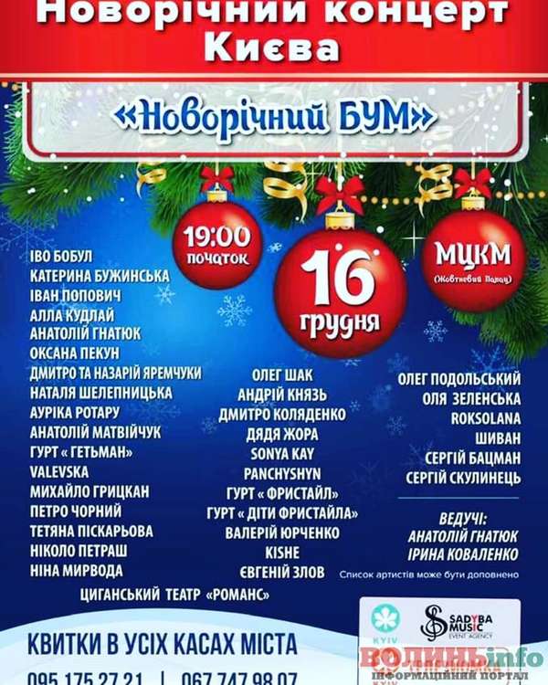 Вже завтра, 16 грудня у Міжнародному центрі культури і мистецтв, наш земляк “запалюватиме” на концерті під назвою «Новорічний бум». На одній сцені з ним виступатимуть Kishe, Sonya Kay, Panchyshyn, Іво Бобул, Ауріка Ротару, Алла Кудлай, Петро Чорній, циганський театр «Романс» та інші.