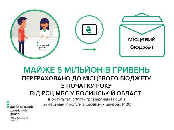 З початку року від РСЦ МВС у Волинській області в результаті сплати громадянами рахунків за отримання адміністративних послуг до місцевого бюджету надійшло майже п`ять мільйонів гривень (4 949 166, 74 грн.).