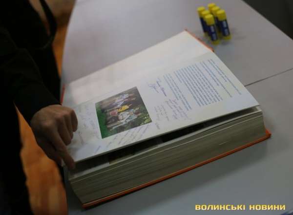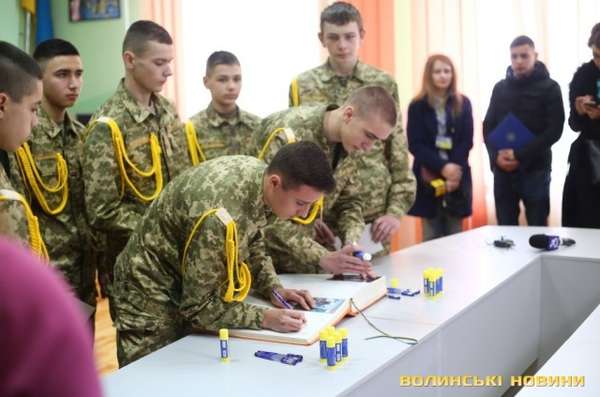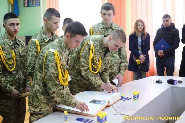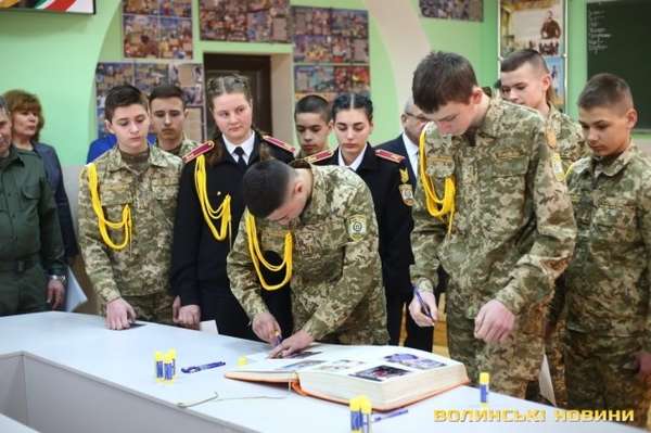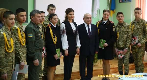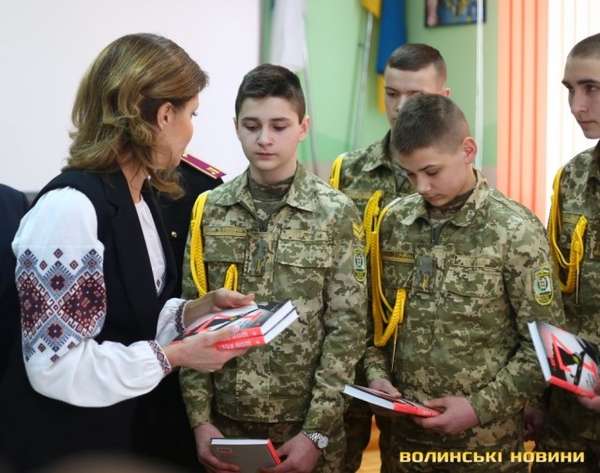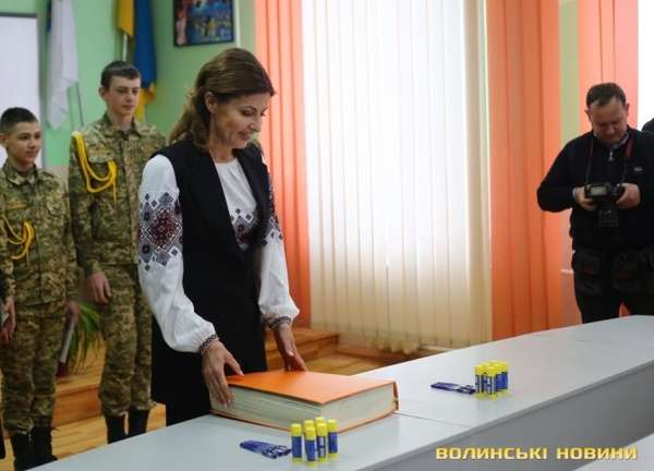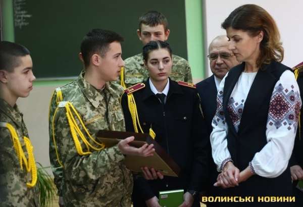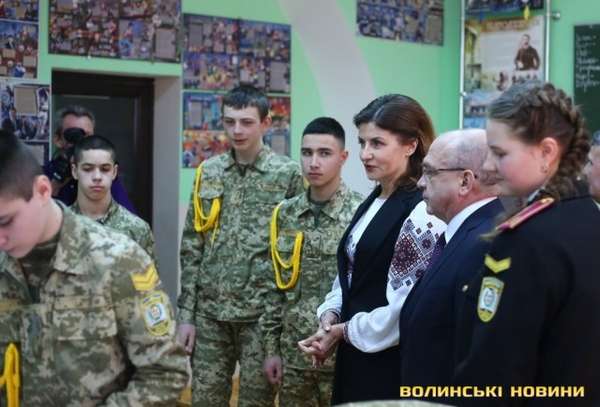Розпочався візит першої леді на Волинь 21 лютого з відвідин обласного ліцею з посиленою військово-фізичною підготовкою. Там Марина Порошенко заповнила разом з ліцеїстами новий розділ «Книги Миру», де свої побажання записують діти тих, хто боронить Україну.
