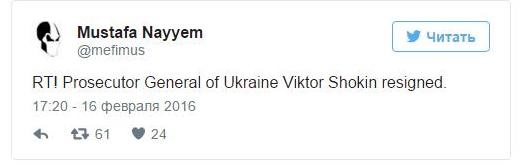 «Генпрокурор України Віктор Шокін подав у відставку», — написав нардеп у своєму акаунті у Tвітері.