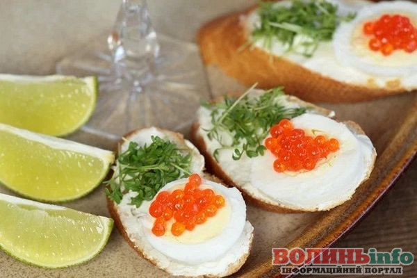 Зверху викладіть зелень, яйця та червону ікру. За бажанням збризніть бутерброди лимонним соком.