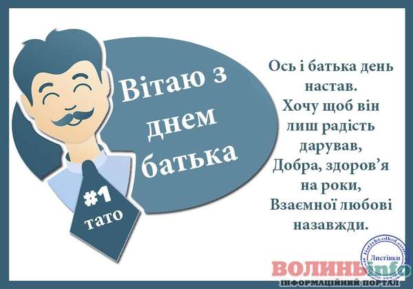 Вітаю з Днем батька! Бажаю завжди залишатися прикладом сміливості, мудрості, впевненості і сили. Бути батьком — справа складна, бажаю справлятися з нею на всі двісті відсотків!