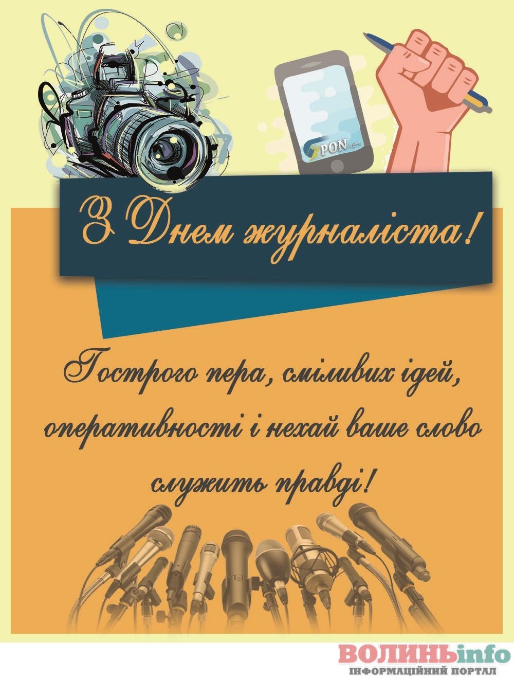 Вітаємо українських журналістів з їхнім професійним святом. Ви буваєте в різних місцях, відриваючи спеціально для нас свіжі, цікаві новини. Дякуємо! Бажаємо, щоб робота кипіла, а репортажі були тільки позитивними. З Днем журналіста України!