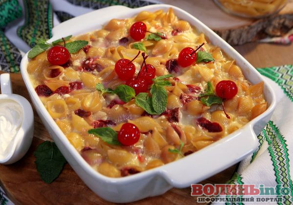 Солодкий макаронний пиріг із сиром та вишневим варенням
