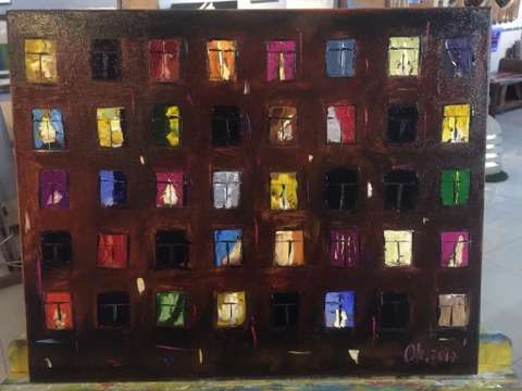 Лот №2 – картина із зображенням будинку з сяючими вікнами. Початкова ціна – 2000 гривень. Мінімальний крок для наступної ставки – 100 гривень.