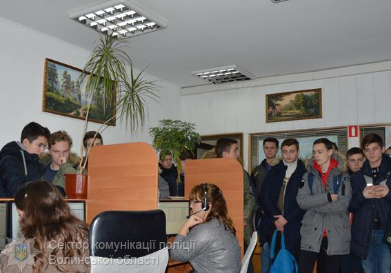 Гості побували в черговій частині поліції, ознайомилися з особливостями її роботи. Студенти відвідали також відділ інформаційної підтримки та координації поліції «102». Керівник підрозділу Михайло Гаврилюк розповів про те, яким чином у поліції фіксують повідомлення громадян, і як на них реагують слідчо-оперативні групи та групи реагування патрульної поліції.