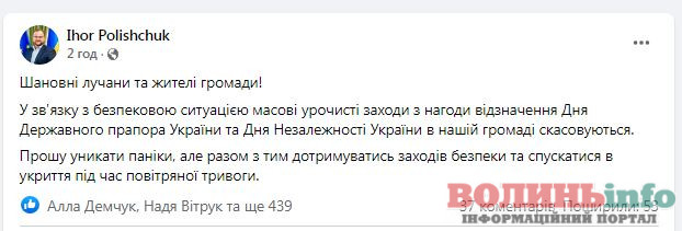 23 та 24 серпня у Луцьку урочистих заходи з нагоди Дня Державного прапора та Дня Незалежності України не буде. Натомість лучанам та гостям міста радять дотримуватись заходів безпеки та спускатися в укриття під час повітряної тривоги.