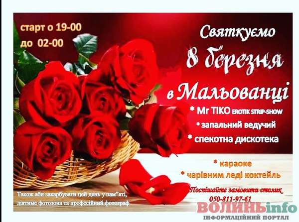 У «Мальованці» для справжніх леді 8 березня запалюватиме Mr Tikо(erotik strip-show), а ведучий вечора не дасть можливості занудьгувати нікому. Ви зможете досхочу натанцюватись на спекотній дискотеці, а чарівним леді й коктейлів досхочу.