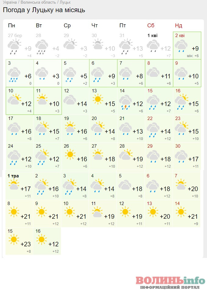 У західних областях на початку квітня очікується досить тепла денна температура повітря. В Ужгороді температура повітря вдень прогріється до +14… +18 градусів. До Великодня буде стояти сонячна та тепла погода, а от потім слід очікувати на невелике похолодання й періодичні дощі. Будуть дні, коли температура повітря може впасти нижче +10 градусів.
