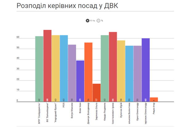 Керівні посади у складі ДВК між представниками кандидатів були розподілені наступним чином: Максим Богун отримав 54 керівні посади (голів – 16, заступників – 19, секретарів – 19), Іван Вовк – 39 (голів – 14, заступників – 12, секретарів – 13), Володимир Демчук – 56 (голів – 18, заступників – 20, секретарів – 18), Ольга Зирянова – 17 (голів – 5, заступників – 7, секретарів – 5), Людмила Кирда – 63 (голів – 22, заступників – 20, секретарів – 21), Ірина Констанкевич – 66 (голів – 21, заступників – 22, секретарів – 23), Юрій Кулачек – 58 (голів – 18, заступників – 19, секретарів – 21), Валентина Малькова – 53 (голів – 17, заступників – 20, секретарів – 16), Олександр Орел – 53 (голів – 15, заступників – 19, секретарів – 19) та Олександр Пирожик – 60 (голів – 19, заступників – 21, секретарів – 20).