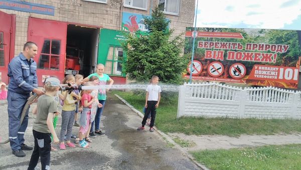 Рятувальники продемонстрували маленьким гостям обладнання пожежного автомобіля та бойовий одяг, що призначений захищати людину, яка у ньому працює, а також розповіли про особливості гасіння типових для краю пожеж.