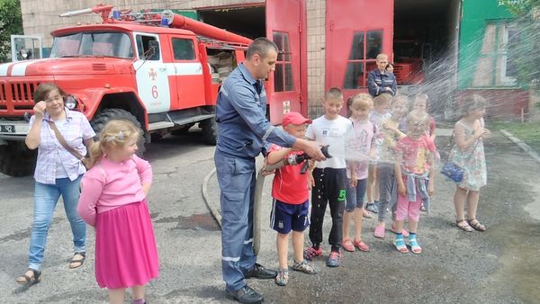 Рятувальники продемонстрували маленьким гостям обладнання пожежного автомобіля та бойовий одяг, що призначений захищати людину, яка у ньому працює, а також розповіли про особливості гасіння типових для краю пожеж.