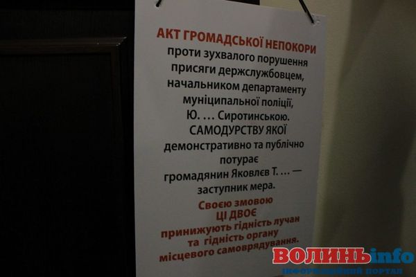 На плакаті зазначено, що чоловік голодує «проти зухвалого порушення держслужбовцем, начальником департаменту муніципальної поліції Юлії Сиротинської, самодурству якої демонстративно та публічно потурає перший заступник міського голови Тарас Яковлев. Своєю змовою ці двоє принижують гідність лучан та гідність органу місцевого самоврядування».