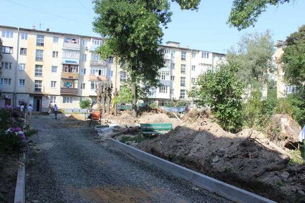 Насамкінець побували на прибудинковій території на проспекті Грушевського, 7, 9, 9а. Тут теж активно тривають ремонтні роботи. Місцеві мешканці розповіли, що капітальний ремонт тут відбувається вперше за вперше за 18 років.