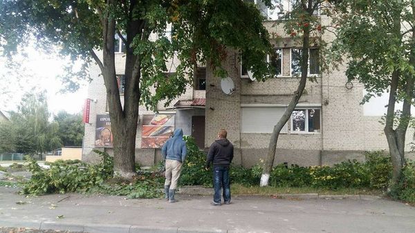У Луцьку чоловіки намагалися зрізати гілки дерева, які закривали вивіску магазину. ФОТО
