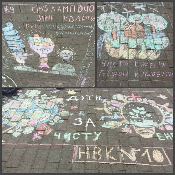 Маленькі лучани долучилися до конкурсу малюнків на асфальті. Тема малюнка – «Чиста енергія – чисте майбутнє». Таким чином, діти намагалися відобразити своє бачення того, що таке чиста енергія, як можна використовувати енергію сонця, води та вітру в побуті, а також як зменшити споживання енергії.
