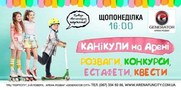 У «GeneratorCity» – нова пропозиція: відтепер щопонеділка о 16 годині відбуватиметься акція «Канікули на Арені». У програмі розваги, конкурси, естафети та конкурси. Запрошують усіх, хто обожнює катання на роликах, драйв та гарний настрій.