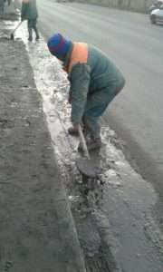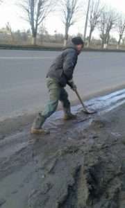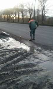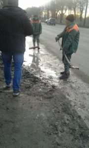 Під час візиту на будівництво муніципалів, працівники будівельної організації взялися очищати вулицю від бруду та болота, яким вантажівки забруднили проїжджу частину.