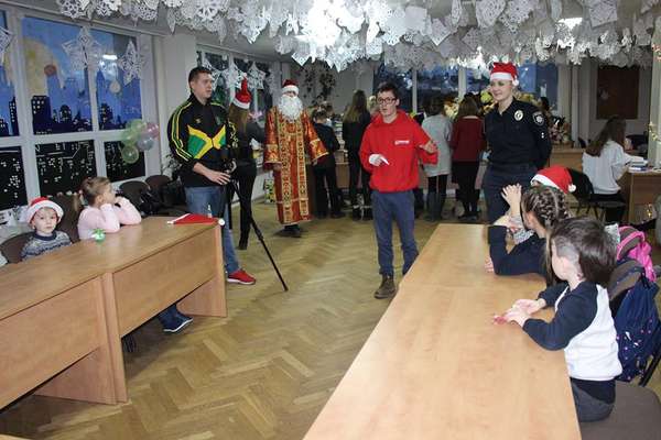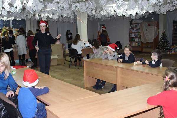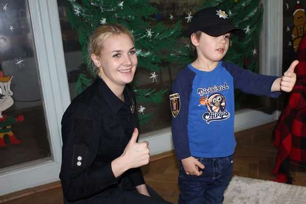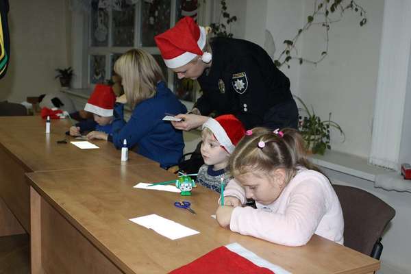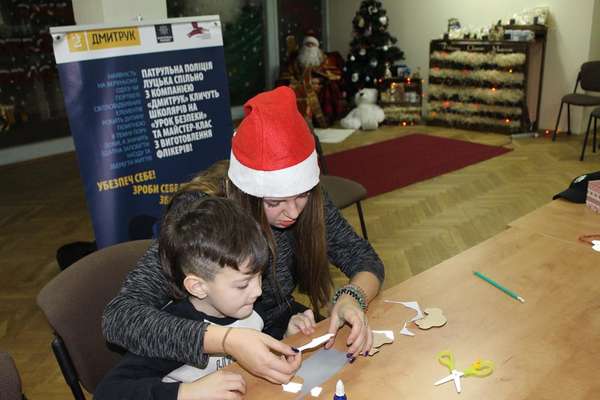 Волонтери Фабрики, учасники майстер-класу і сам Святий Миколай були дуже раді бачити інспекторку Патрульної поліції, яка спочатку розповіла, навіщо потрібні світловідбиваючі елементи на одязі, а потім допомагала дітям виготовляти їх.