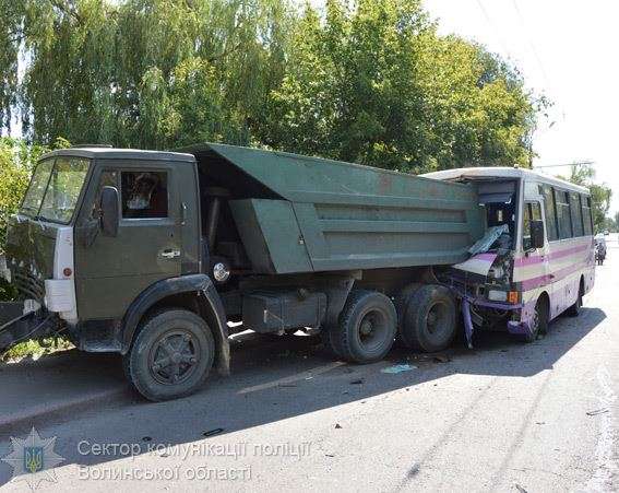 За кермом маршрутного таксі, сполученням Луцьк – Колки, перебував 57-річний житель Рожищенського району. Керуючи транспортним засобом, водій допучтив зіткення з вантажівкою «Камаз», під керуванням 66-річного лучанина, яка рухалася у попутному напрямку.