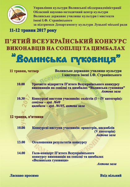 11-12 травня 2017 року у Луцьку відбудеться п’ятий Всеукраїнський конкурс виконавців на сопілці та цимбалах «Волинська гуковиця».