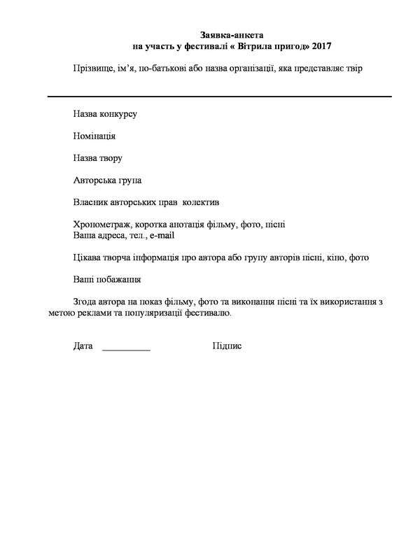 5.4. Учасники фестивалю мають заповнити реєстраційну форму (заявку) та надіслати її з власним твором, відповідно до вимог на поштову та електронну адреси оргкомітету фестивалю.