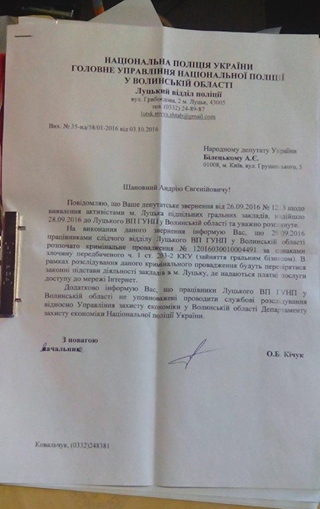 У зверненні Лідер Азовського Руху запитував про ситуації щодо виявленого активістами Цивільного Корпусу АЗОВ Волинь нелегального грального закладу.