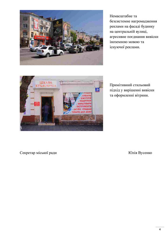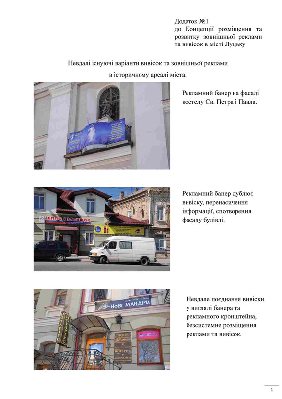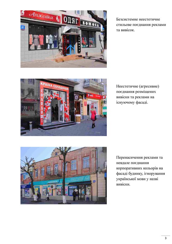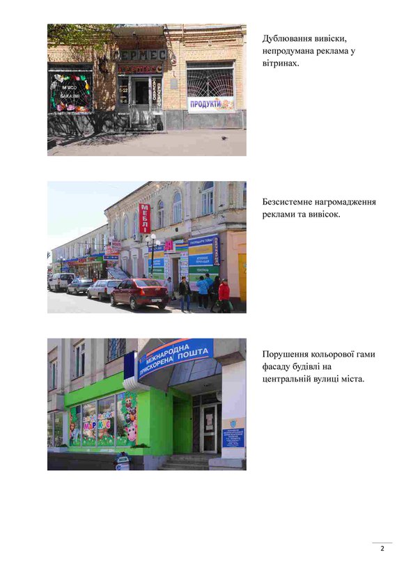 Спотворює архітектуру та естетичний вигляд будівель розміщення на парадних фасадах рекламних засобів різноманітних розмірів, виготовлених на банерній тканині, шляхом наклеювання рекламної плівки на зовнішній поверхні фасаду.
