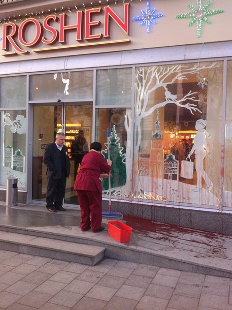 Біля магазину вони зупинилися і з вигуками “Геть шоколадного зрадника!” повісили на дереві опудало, яке, за їхніми словами, мало символізувати президента України, облили фасад приміщення і скляні вітрини червоною фарбою, яка повинна була символізувати кров. Після цього – близько 16:00 – учасники маршу розійшлися.