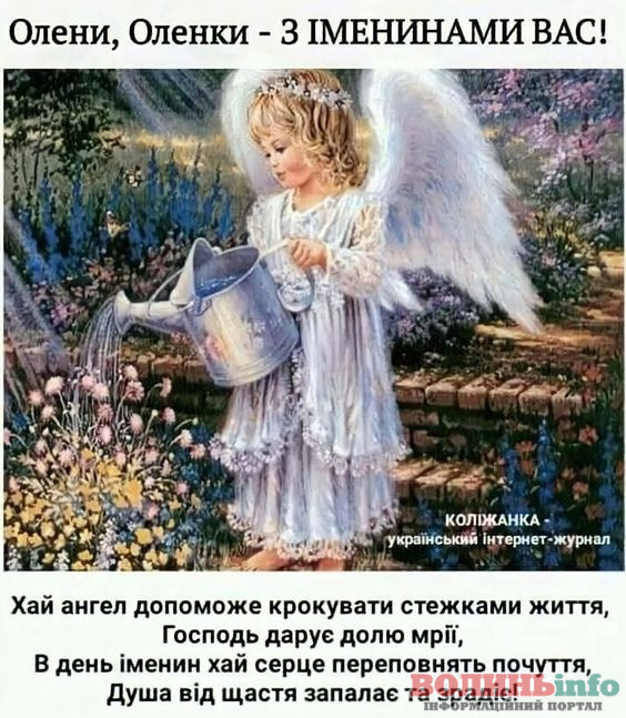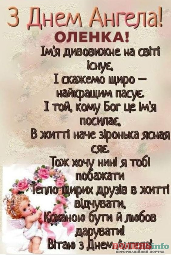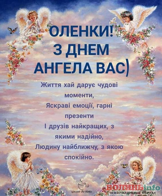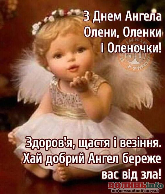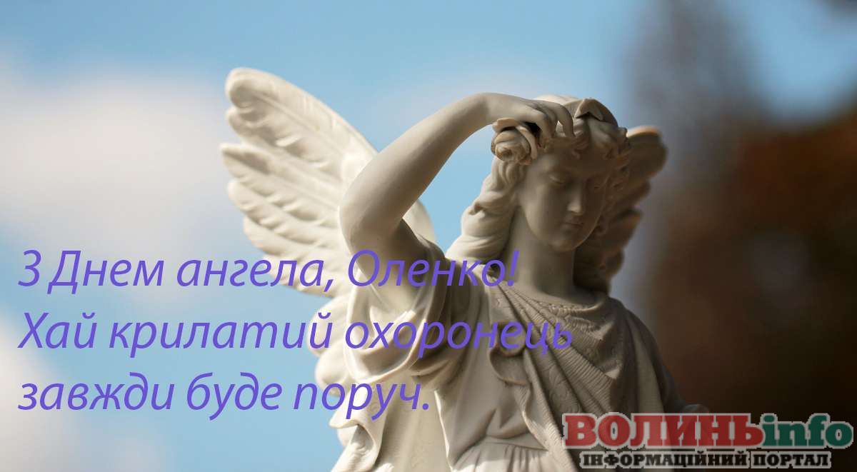 Оленко, сьогодні твій день ангела – свято твого уважного небесного покровителя. Його не можна побачити на власні очі, але можна зрозуміти з тих життєвих змін, які, як нам здається, відбулися зовсім випадково. Воля випадку завжди в руках ангела і я тобі бажаю щиро вірити в його силу і твердо, впевнено йти по життю, пам’ятаючи про його опіку.