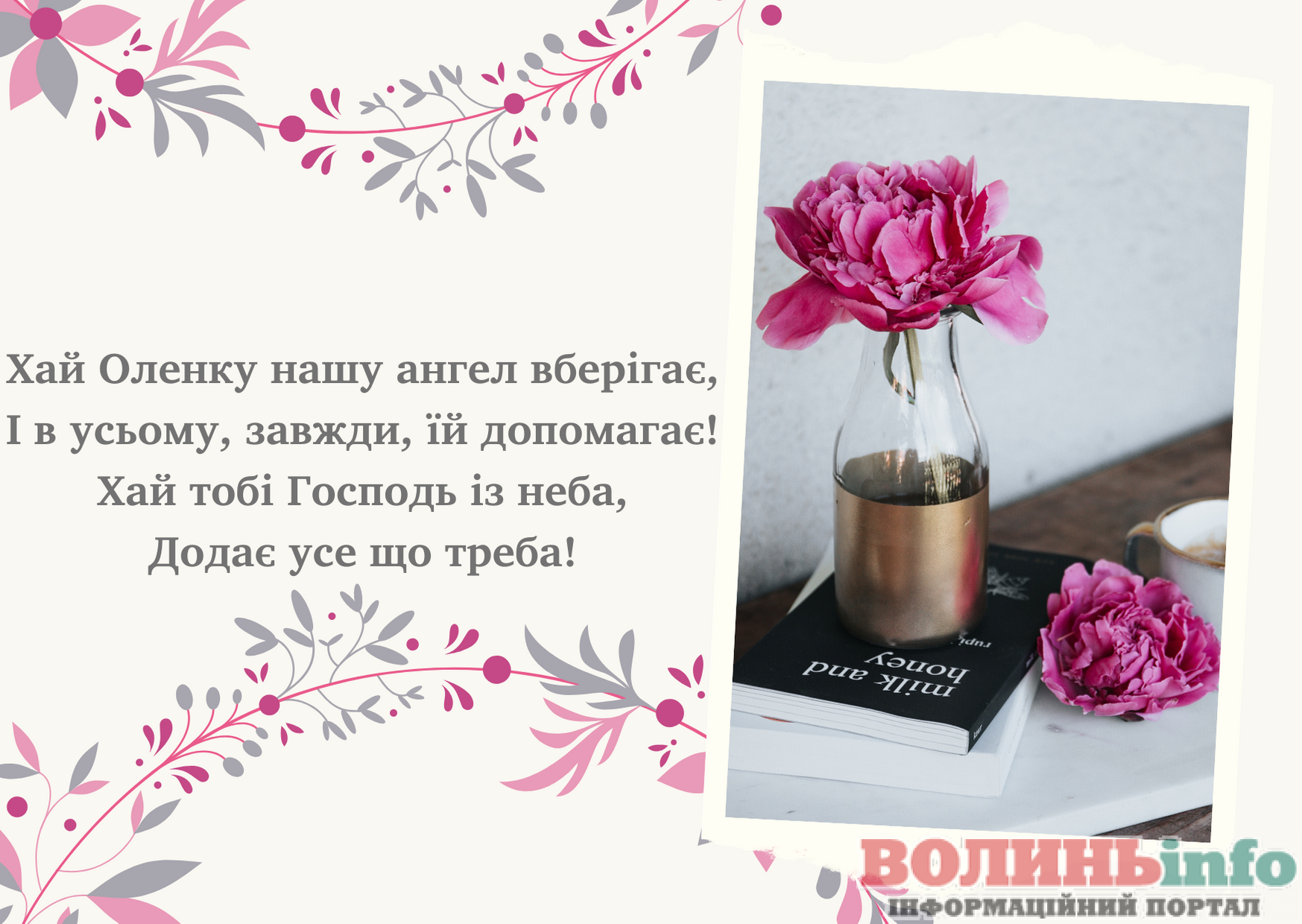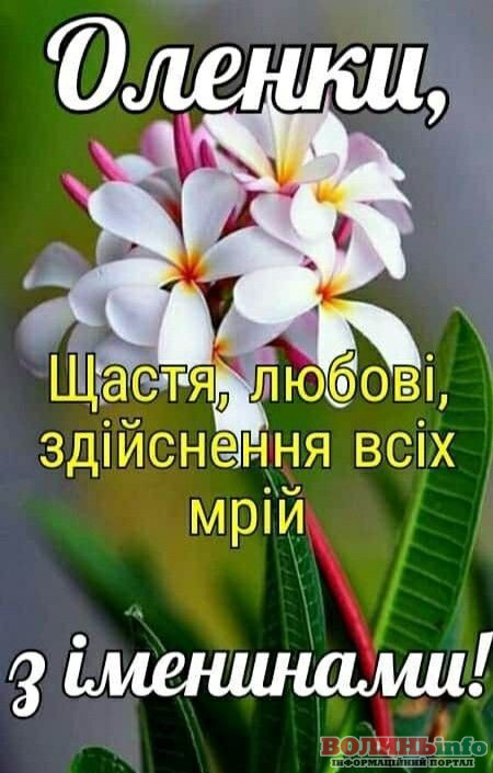 Оленко, вітаю тебе зі святом! Бажаю неймовірного життєлюбства, втілення всіх мрій та досягнення цілей. Нехай буде багато радості й усмішок, підтримки й розуміння, надій і вражень! Ти – дивовижна, всього тобі найкращого!