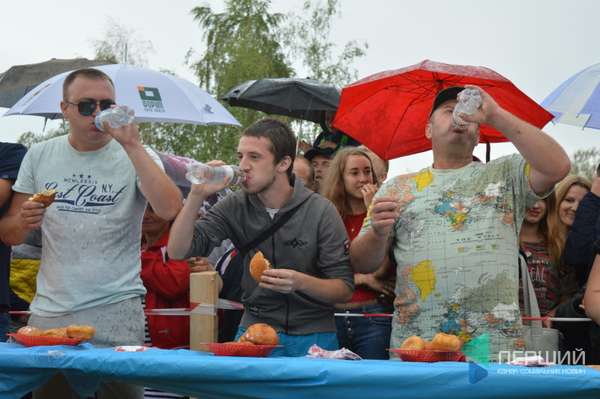 Зголосились взяти участь у конкурсі шестеро сміливців, з яких п’ять чоловіків та одна жінка. Кожному дали по шість пончиків та хвилині часу. Також дозволялось запивати смаколики водою.