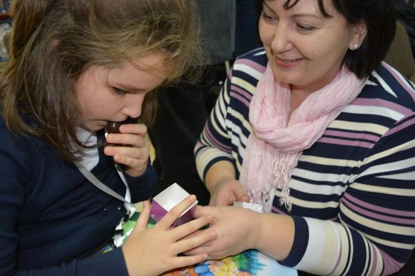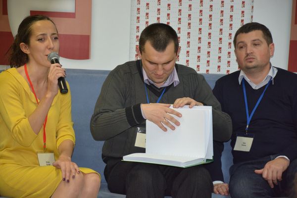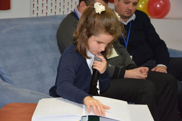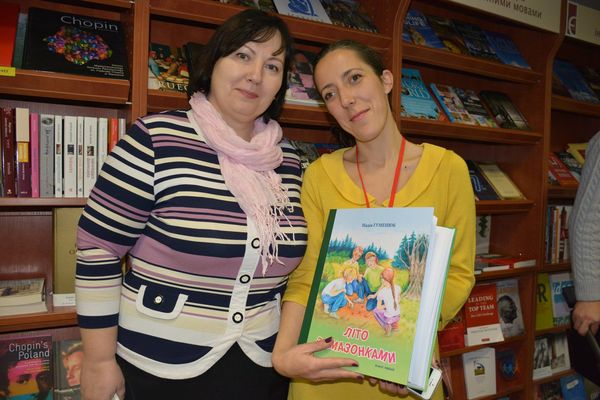 У затишній залі зібралися журналісти, видавці, незрячі читачі, відомі письменники, серед яких й авторки збірки «Волонтери»: Ірина Славінська, Галина Шиян, Катерина Бабкіна. Вони із задоволенням розглядали велитенські брайлівські книжки з «білими» сторінками, читали уривки зі своїх оповідань, що увійшли до збірки, та розповідали цікаві історії. Завітала до нас й маленька читачка – дев’ятирічна Сашенька Колесник, яка першою взяла до рук книгу Надії Гуменюк «Літо з амазонками». Дівчинка зачитала невеличкий уривочок з цієї повісті і отримала книжки у подарунок. Свого захоплення від свіженьких книжок не стримувала не лише дитина, але й дорослі…