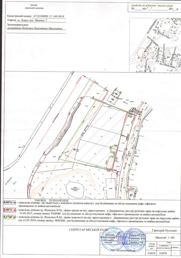 Земельну ділянку несільськогосподарського призначення комунальної власності на вулиці Франка, 3, площею 0,0076 га, кадастровим номером 0710100000:11:160:0018, вирішили продати для будівництва та обслуговування кафе, офісного приміщення та мийки автомобілів для підприємця Валентини Федонюк.