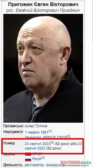 До слова, у Вікіпедії ще вчора ввечері з’явилися оновлення із датою смерті Пригожина – 23.08.23