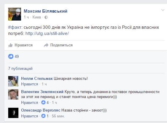 “Сьогодні 300 днів, як Україна не імпортує газу з Росії для власних потреб”, — написав він у Facebook.