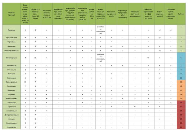 Оцінка у липні 2016 року охопила сайти 22-ох обласних управлінь лісового та мисливського господарства. Найжахливіший стан сайту зафіксовано у Чернігівського управління лісовим і мисливським господарством. Формально сайт існує, але на ньому взагалі немає інформації, яка має бути згідно з чинним законодавством (відсутня інформація по всіх 12 пунктах, за якими проводився аналіз). Друге місце з кінця займає Хмельницький лісгосп (відсутня інформація по 11 пунктах), а закінчує ганебну трійку Сумське управління (відсутня інформація по 10 пунктах). Найкращим виявився сайт Львівського управління лісового та мисливського господарства.