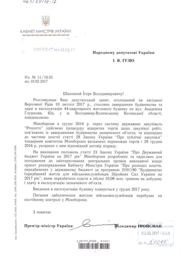 «Введення в експлуатацію будинку планується у грудні 2017 року. Питання забезпечення житлом військовослужбовців перебуває на постійному контролі в Міноборони», — йдеться у відповіді прем’єр-міністра.