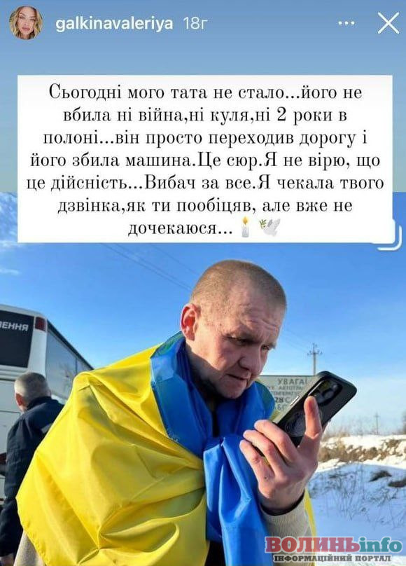 “Сьогодні мого тата не стало… Його не вбила ні війна, ні куля, ні 2 роки в полоні… Він просто переходив дорогу і його збила машина. Це сюр. Я не вірю, що це дійсність… Вибач за все. Я чекала твого дзвінка, як ти пообіцяв, але вже не дочекаюся”, – написала донька загиблого Героя.