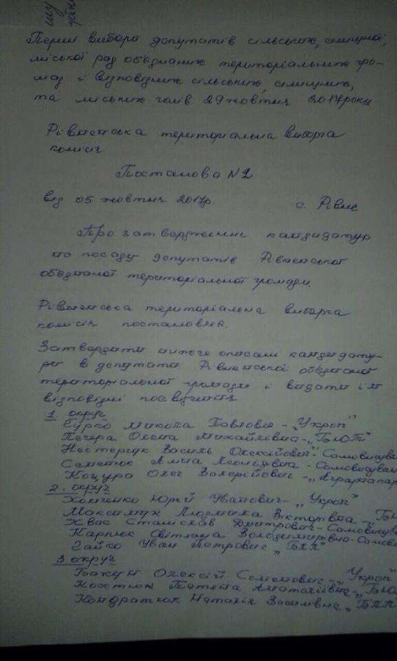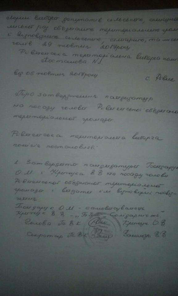 Зокрема, відповідно до Постанови Рівненської сільської виборчої комісії «Про реєстрацію кандидатів на посаду Рівненського сільського голови об’єднаної територіальної громади» від 5 жовтня 2017 р. для участі у виборах Рівненського сільського голови ОТГ зареєстровано: кандидата-самовисуванця Бондарук Ольгу Миколаївну та кандидата, висунутого політичною партією «Блок Петра Порошенка «Солідарність», Крижука Володимира Васильовича.