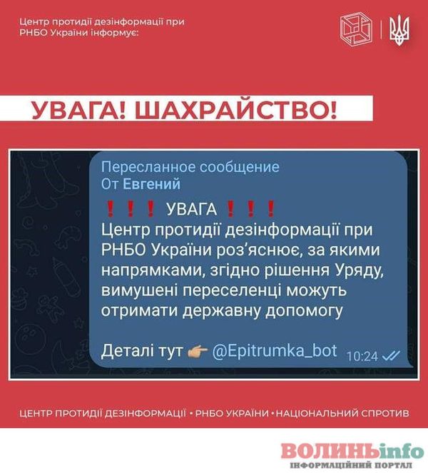 “УВАГА! Центр протидії дезінформації при РНБО України роз’яснює, за якими напрямками, згідно рішення Уряду, вимушені переселенці можуть отримати державну допомогу”. Далі йде посилання на імітований чат-бот, який веде на фейкову сторінку “ПриватБанку”,