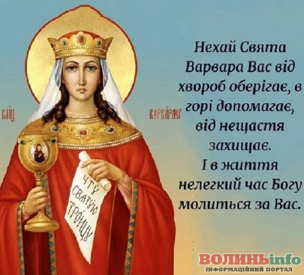 Вітаємо з Днем Святої Великомучениці Варвари Іліопольської, покровительки немічних та рятівниці від раптової смерті. Нехай свята захистить нас від бід, що застерігають на кожному кроці і проведе через усі небезпеки в цілості та неушкодження.