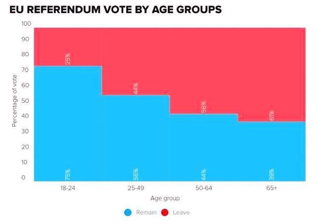 Згідно з цими даними, 75% людей у віці від 18 до 24 років і 56% жителів у віці 25-49 проголосували за те, щоб Британія залишалася в ЄС.