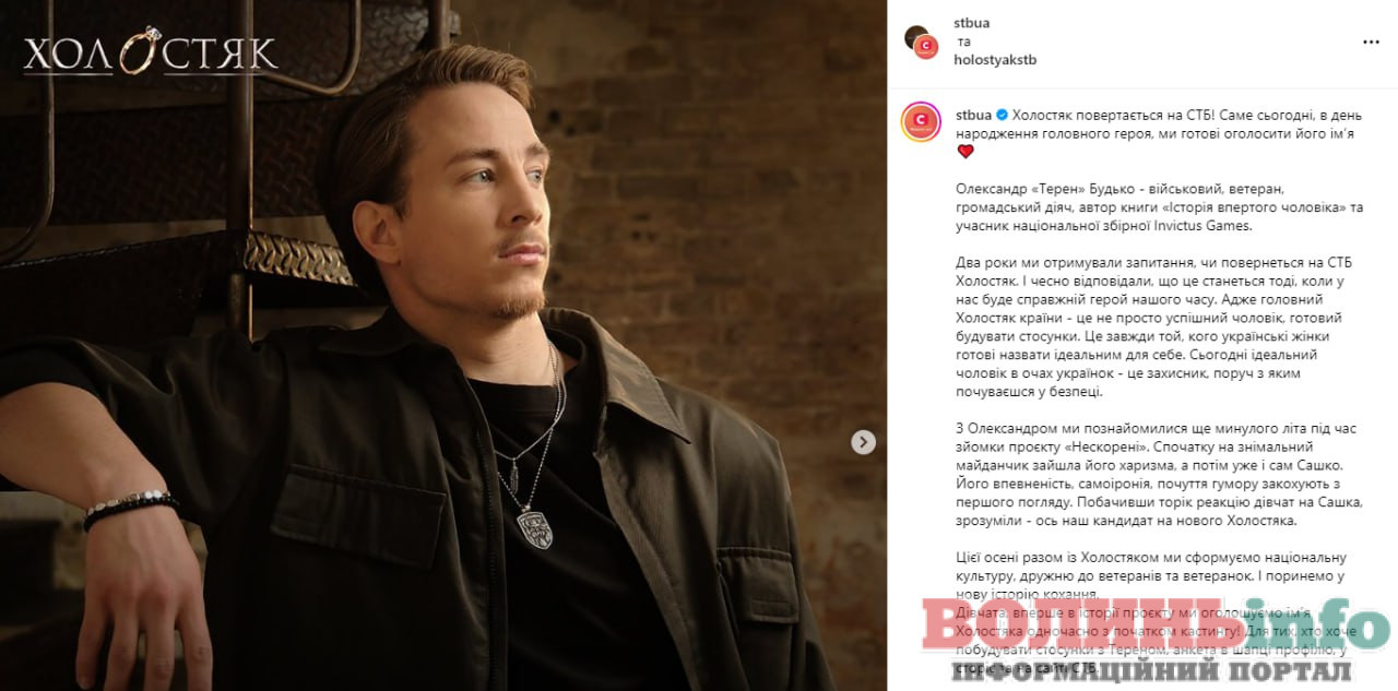 Телеканал СТБ оголосив ім’я нового «Холостяка» – ним став Олександр «Терен» Будько, ветеран російсько-української війни, учасник національної збірної Invictus Games та автор книги «Історія впертого чоловіка».