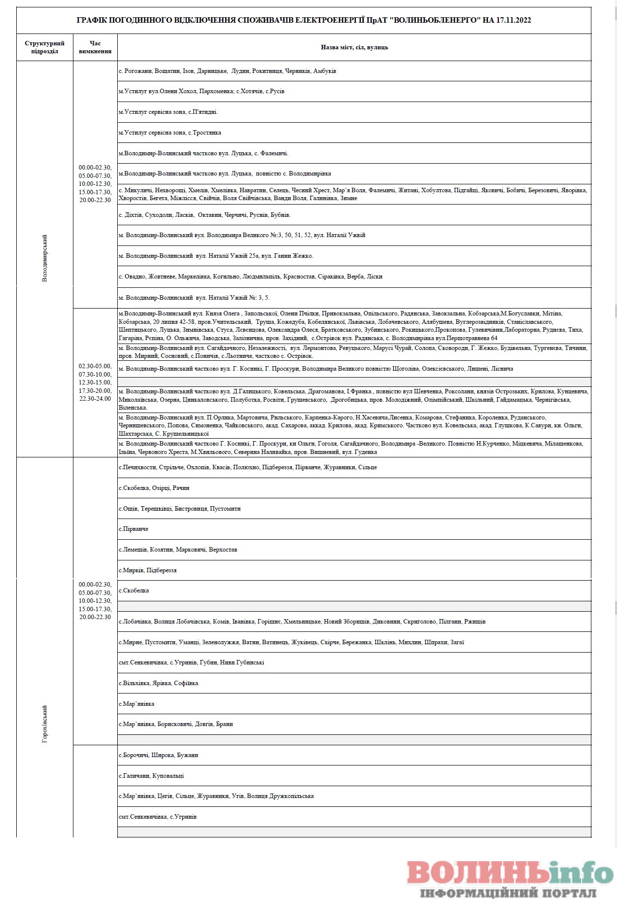 ПрАТ «Волиньобленерго» опублікувало графіки відключення групи споживачів у відповідні години.