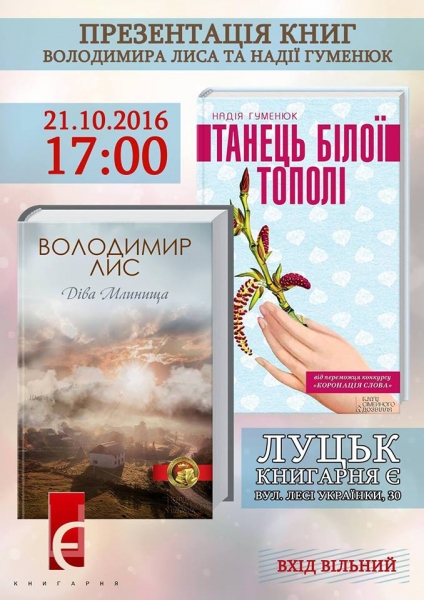 21 жовтня у книгарні «Є» відбудеться презентація книг а («Діва Млинища») та Надії Гуменюк («Танець білої тополі»).