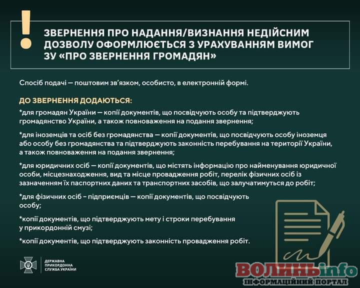 - отримання дозволу особами, які планують здійснювати в’їзд, перебувати та проводити роботи у межах прикордонної смуги, у відповідного органу ДПСУ, який безпосередньо виконує завдання у визначеній зоні відповідальності.